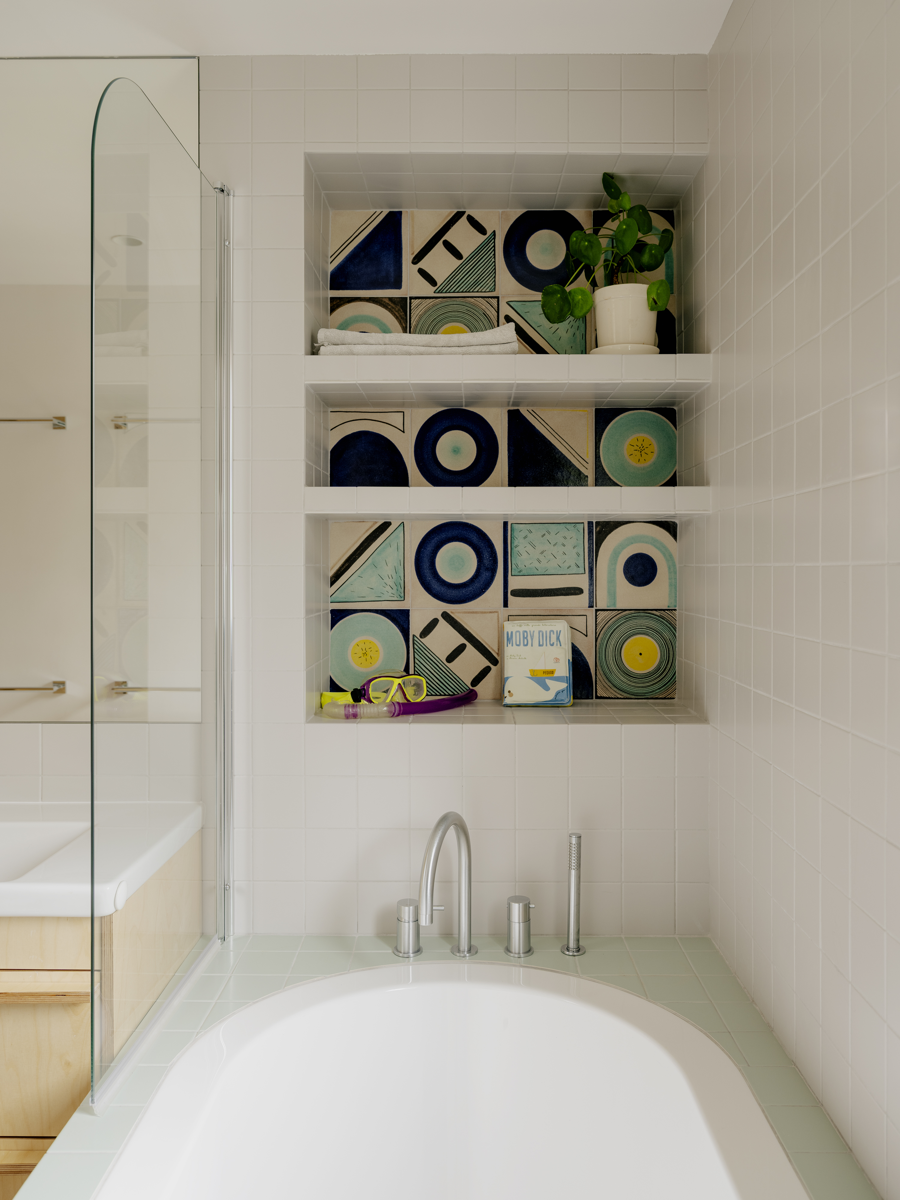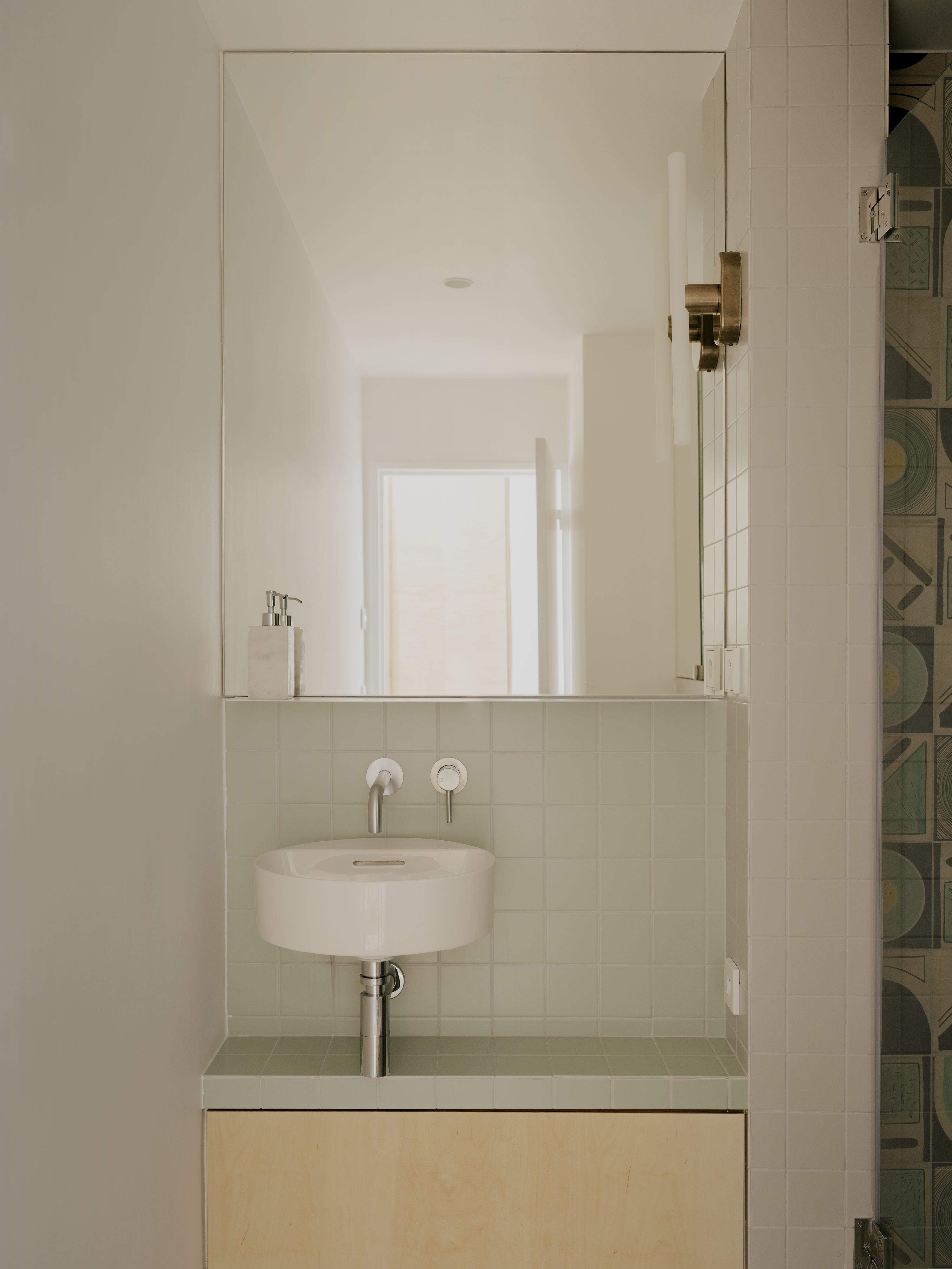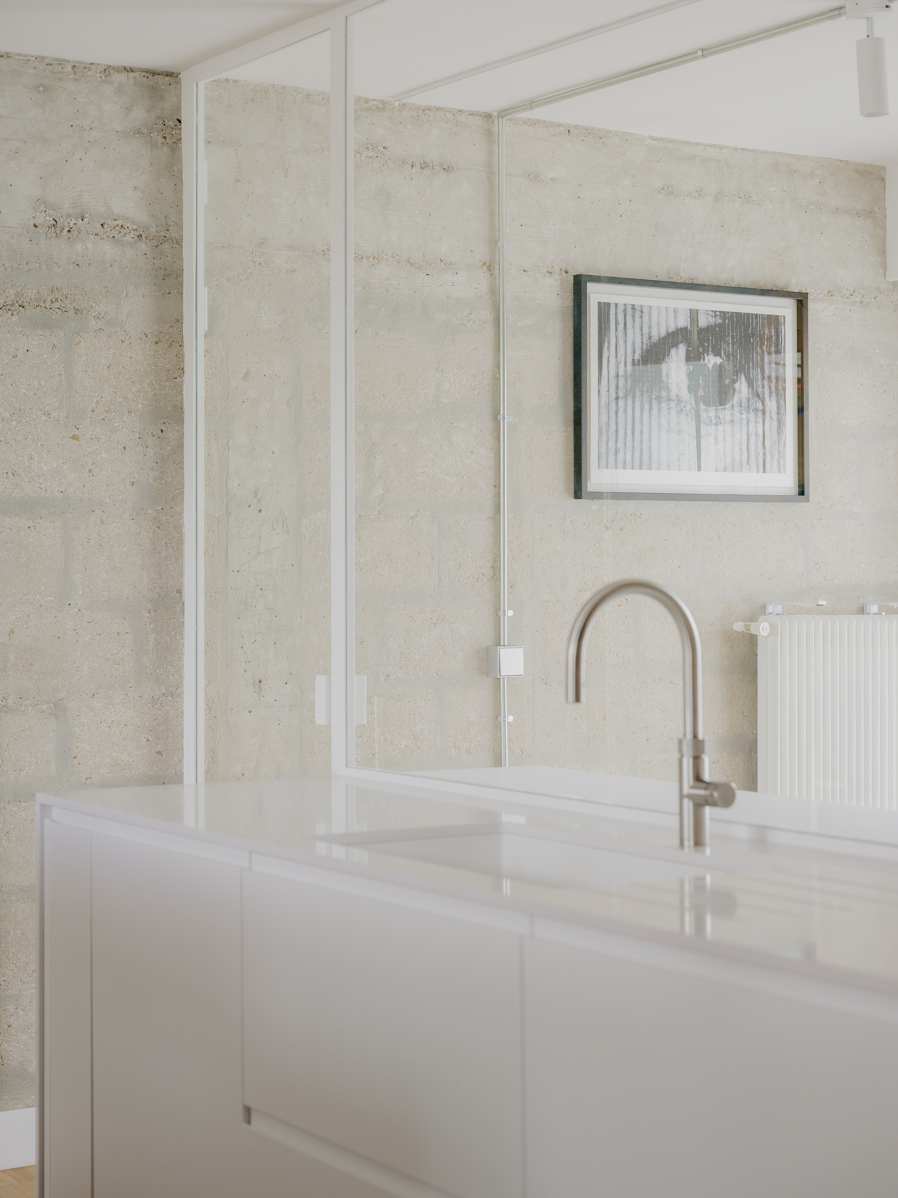 L’effet traversant est préservé grâce à un large panneau vitré installé derrière la crédence : côté cuisine, il accompagne le plan de travail ; côté bureau, il supporte un plateau rabattable qui cache les écrans d’ordinateur.