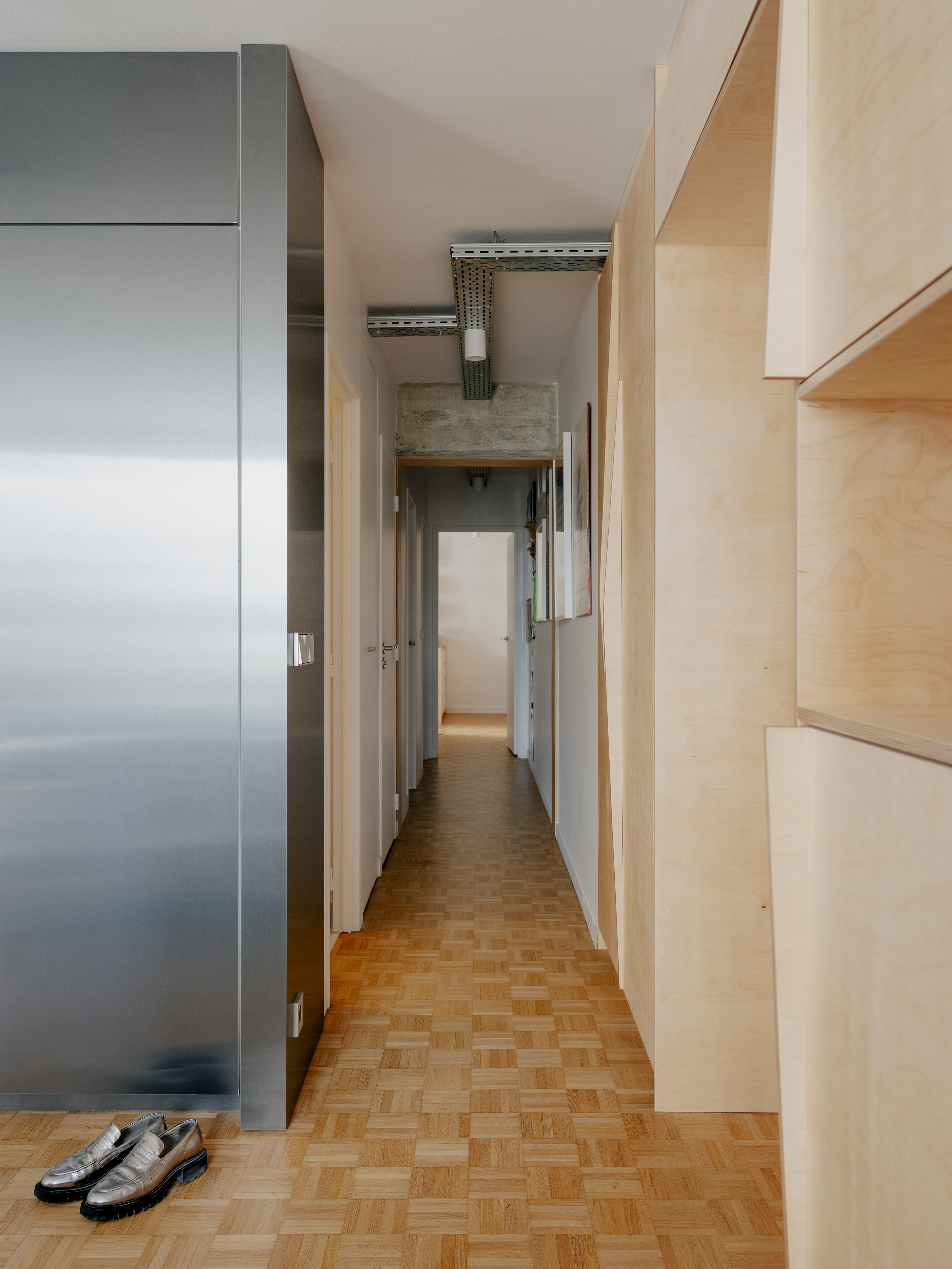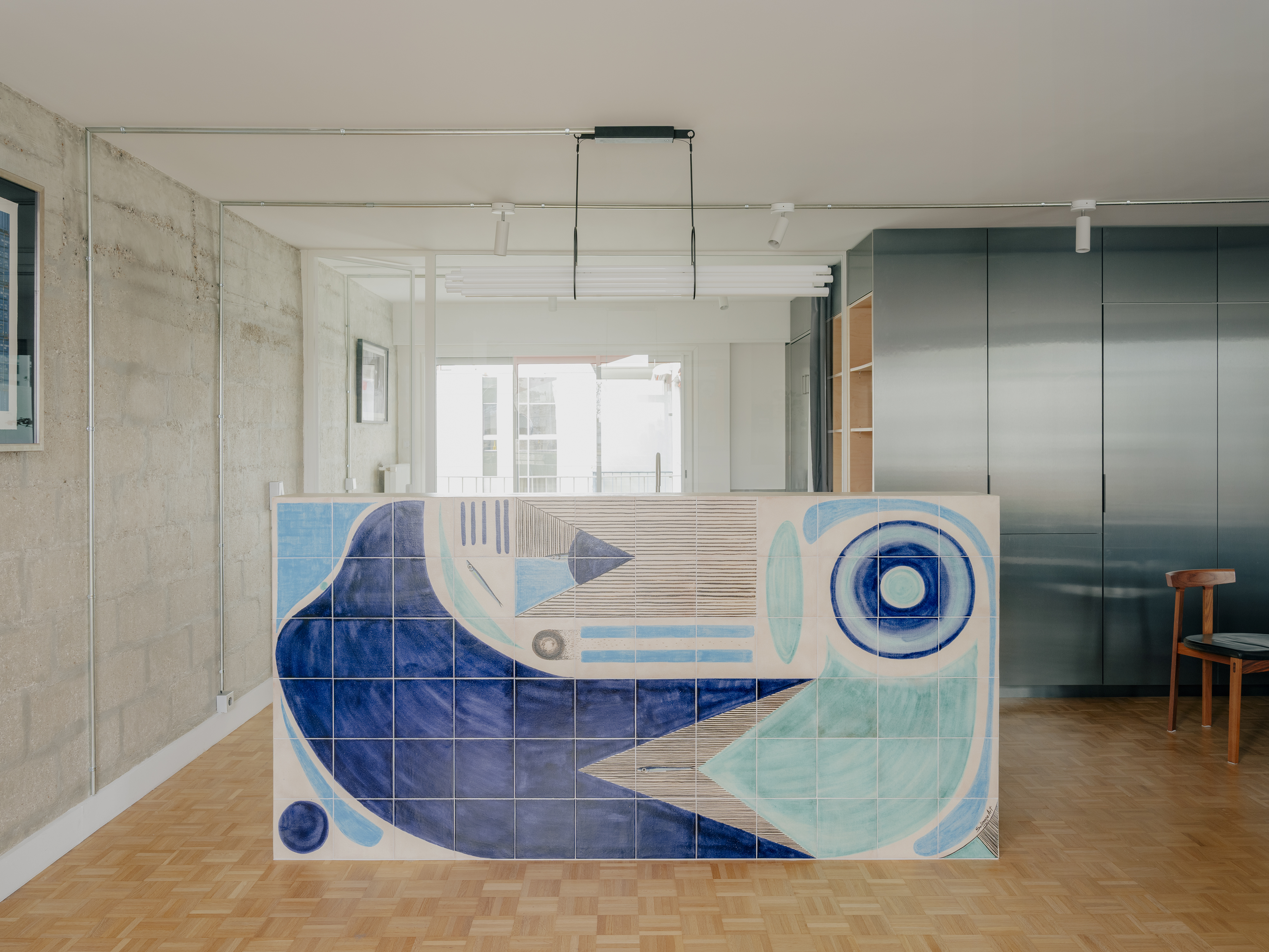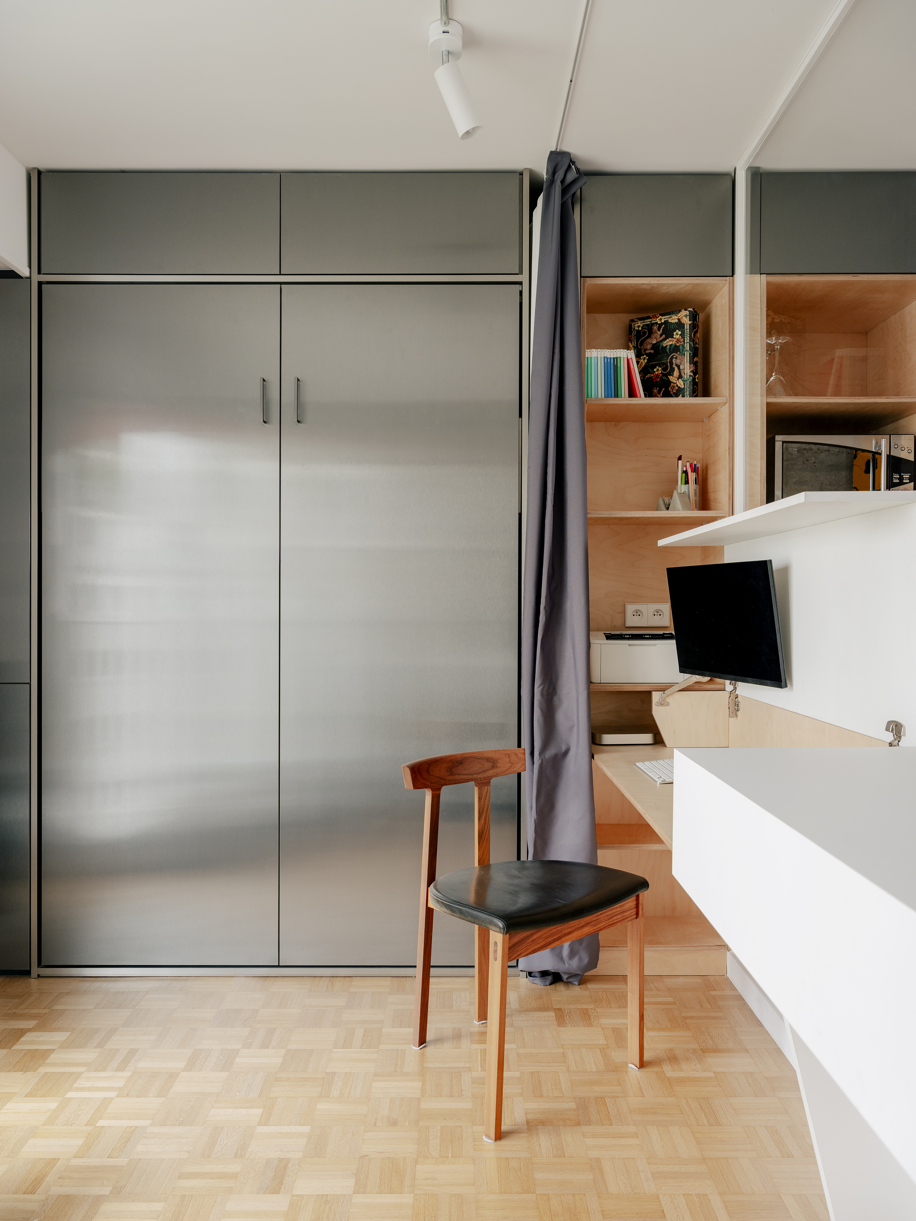 Le séjour, traversant et tout en longueur, est entièrement repensé. Il accueille désormais un bureau ainsi qu’un vaste espace réunissant cuisine, salle à manger et salon. L’ensemble s’organise autour d’un grand meuble central en métal, véritable pivot multifonctionnel : il intègre les rangements de l’entrée, un vidéoprojecteur, des modules de cuisine et un réfrigérateur, puis se prolonge dans le bureau où il dissimule un lit escamotable permettant de transformer ponctuellement la pièce en chambre d’amis.