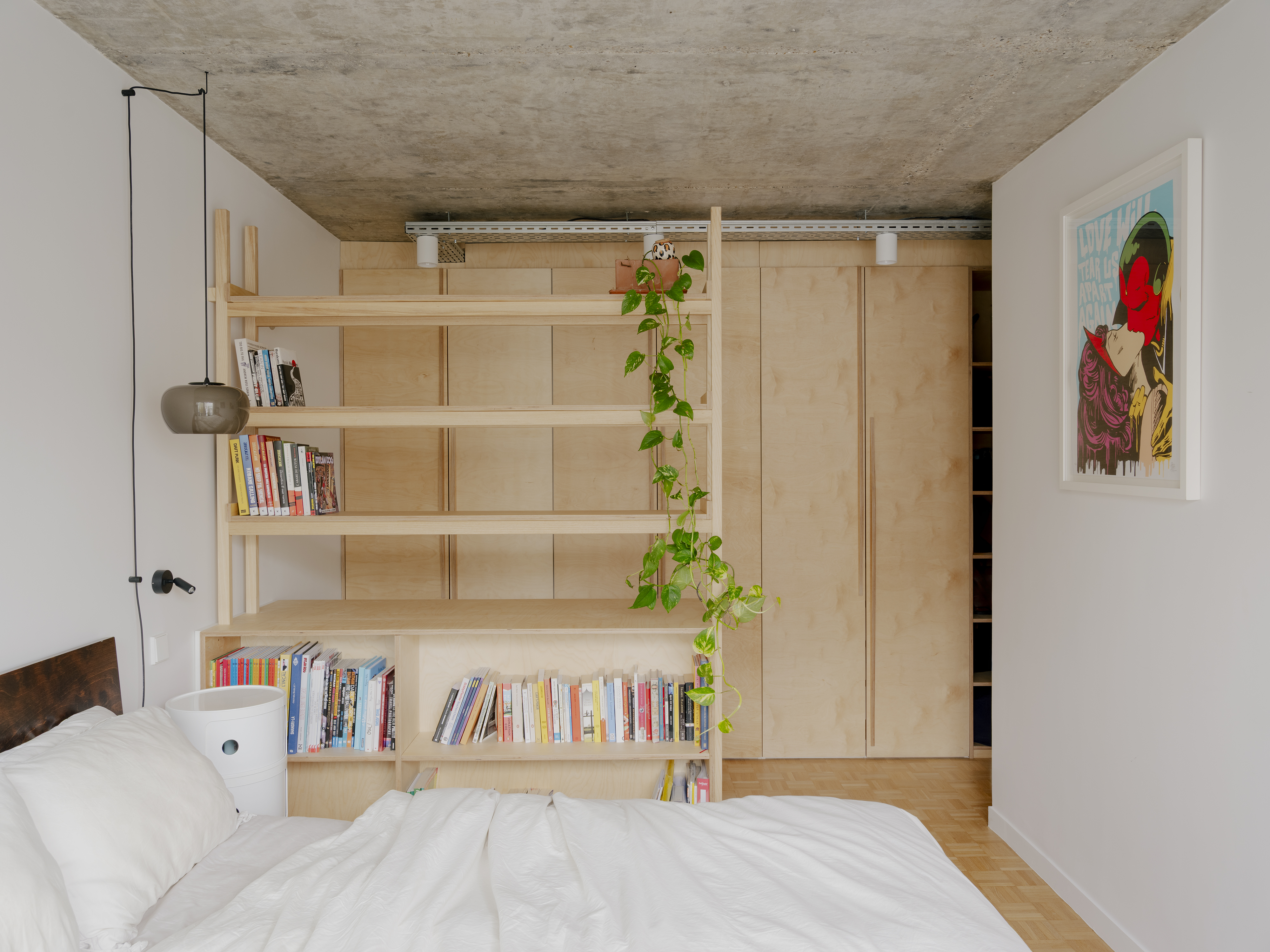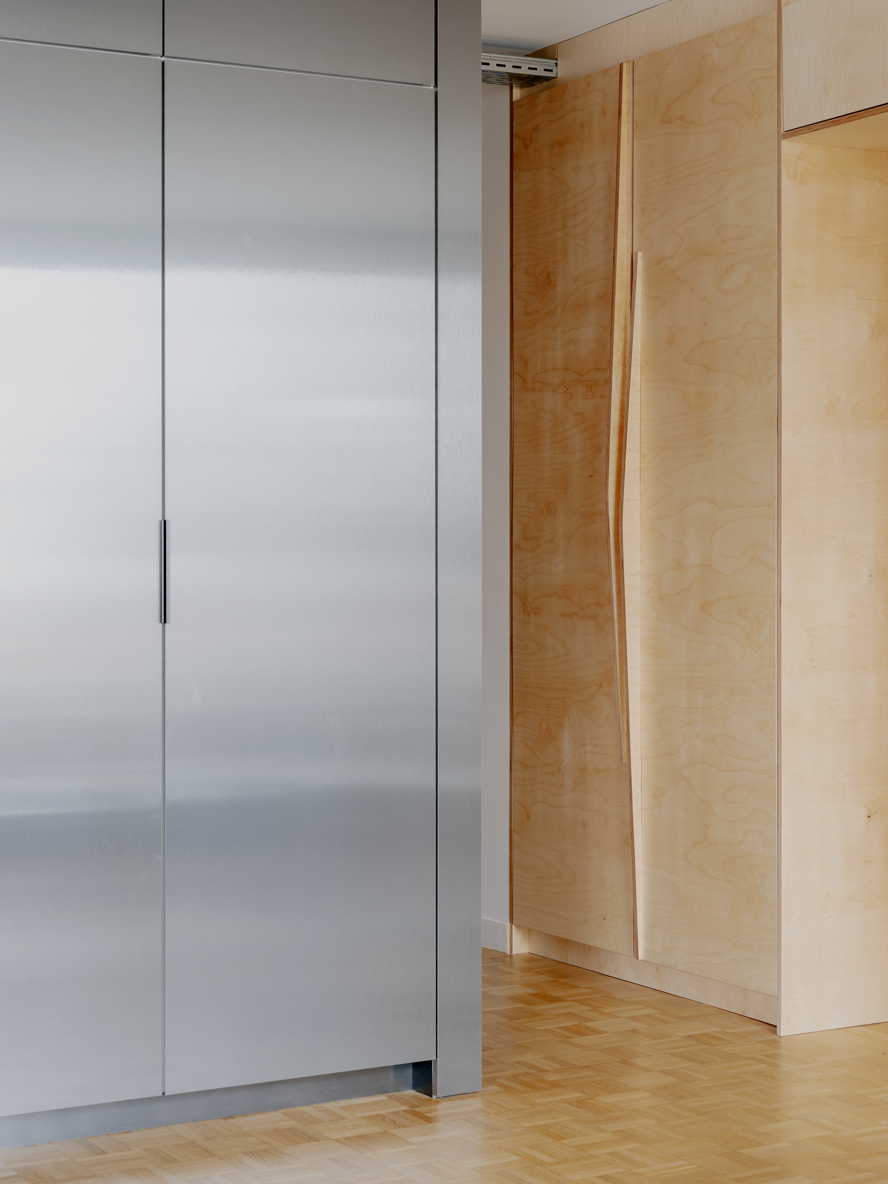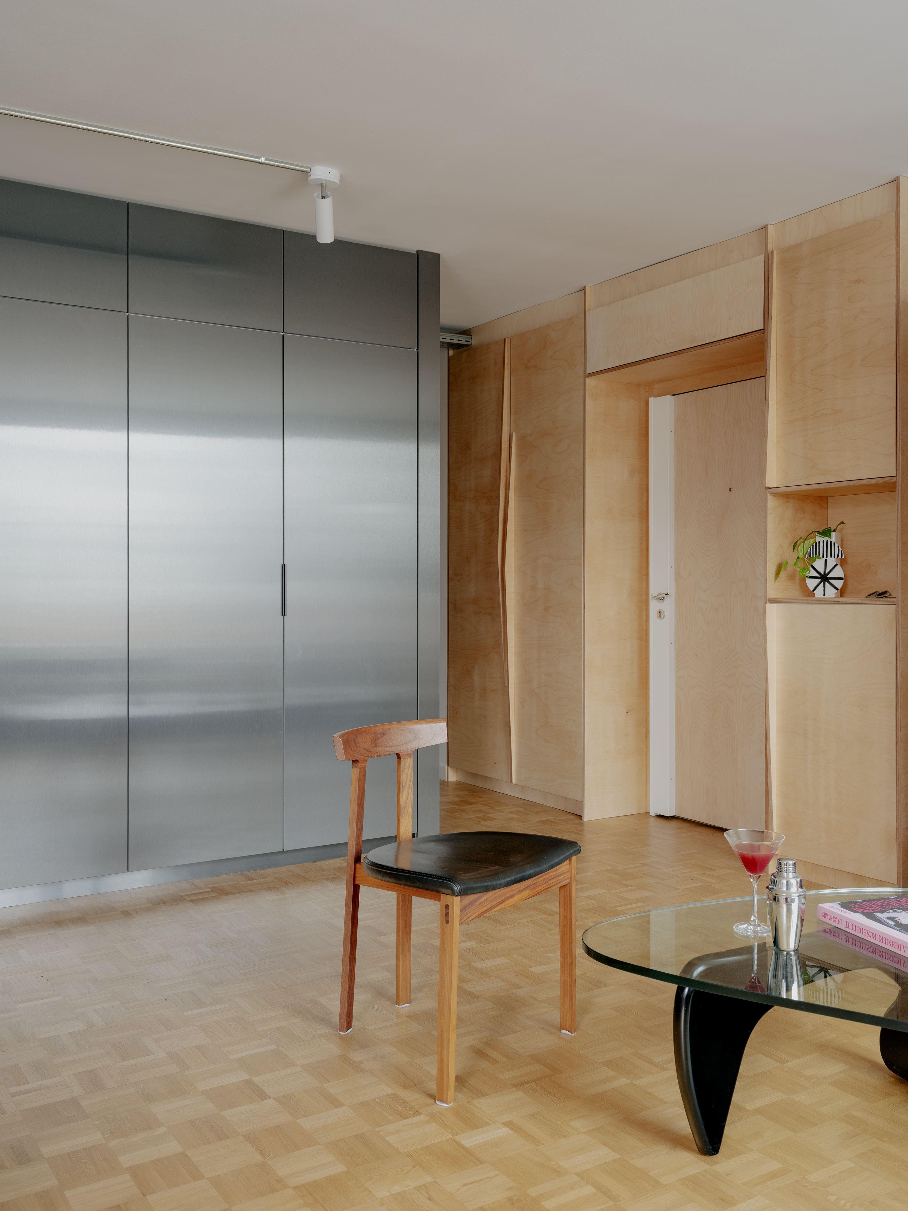 Le séjour, traversant et tout en longueur, est entièrement repensé. Il accueille désormais un bureau ainsi qu’un vaste espace réunissant cuisine, salle à manger et salon. L’ensemble s’organise autour d’un grand meuble central en métal, véritable pivot multifonctionnel : il intègre les rangements de l’entrée, un vidéoprojecteur, des modules de cuisine et un réfrigérateur, puis se prolonge dans le bureau où il dissimule un lit escamotable permettant de transformer ponctuellement la pièce en chambre d’amis.