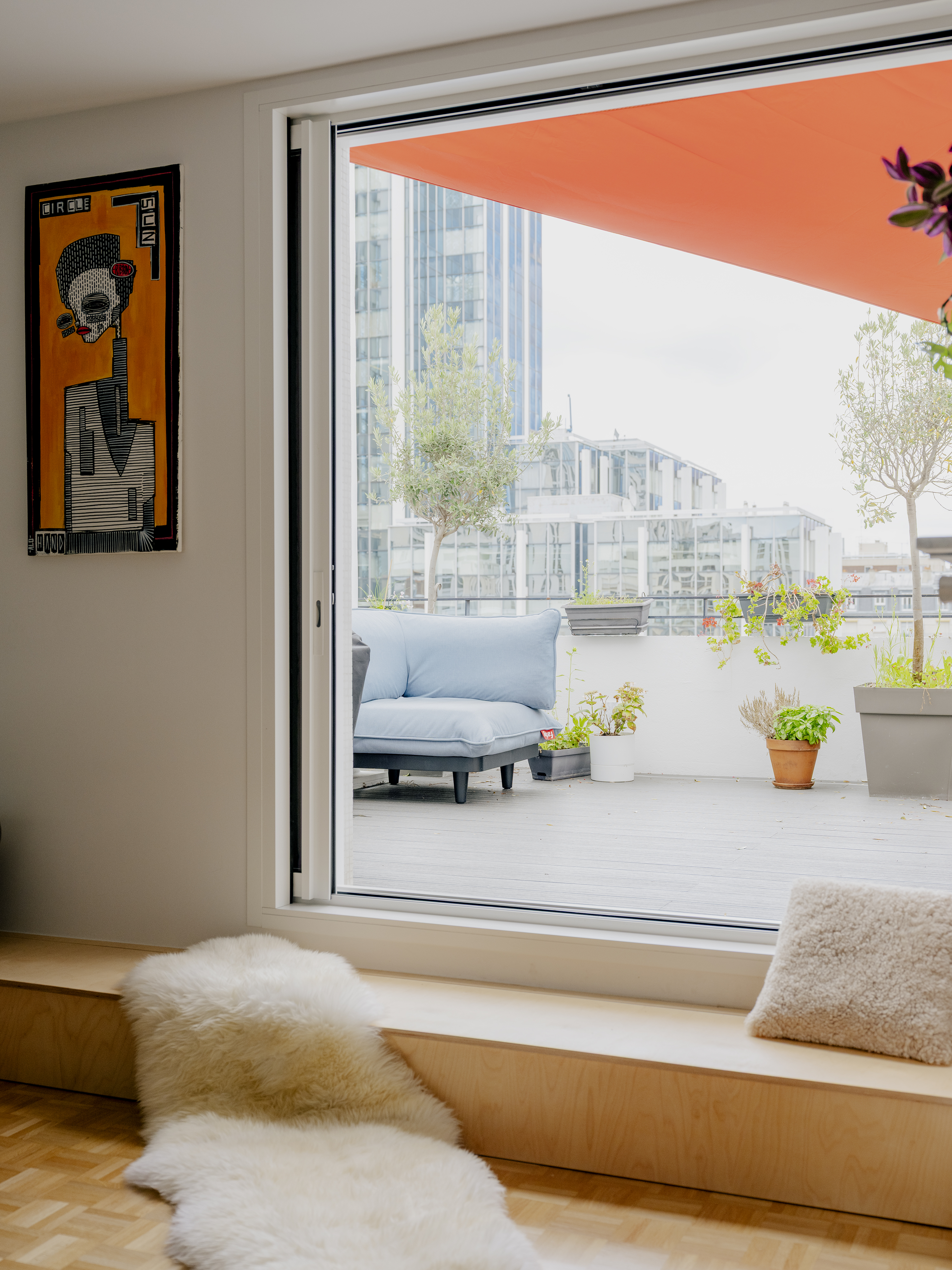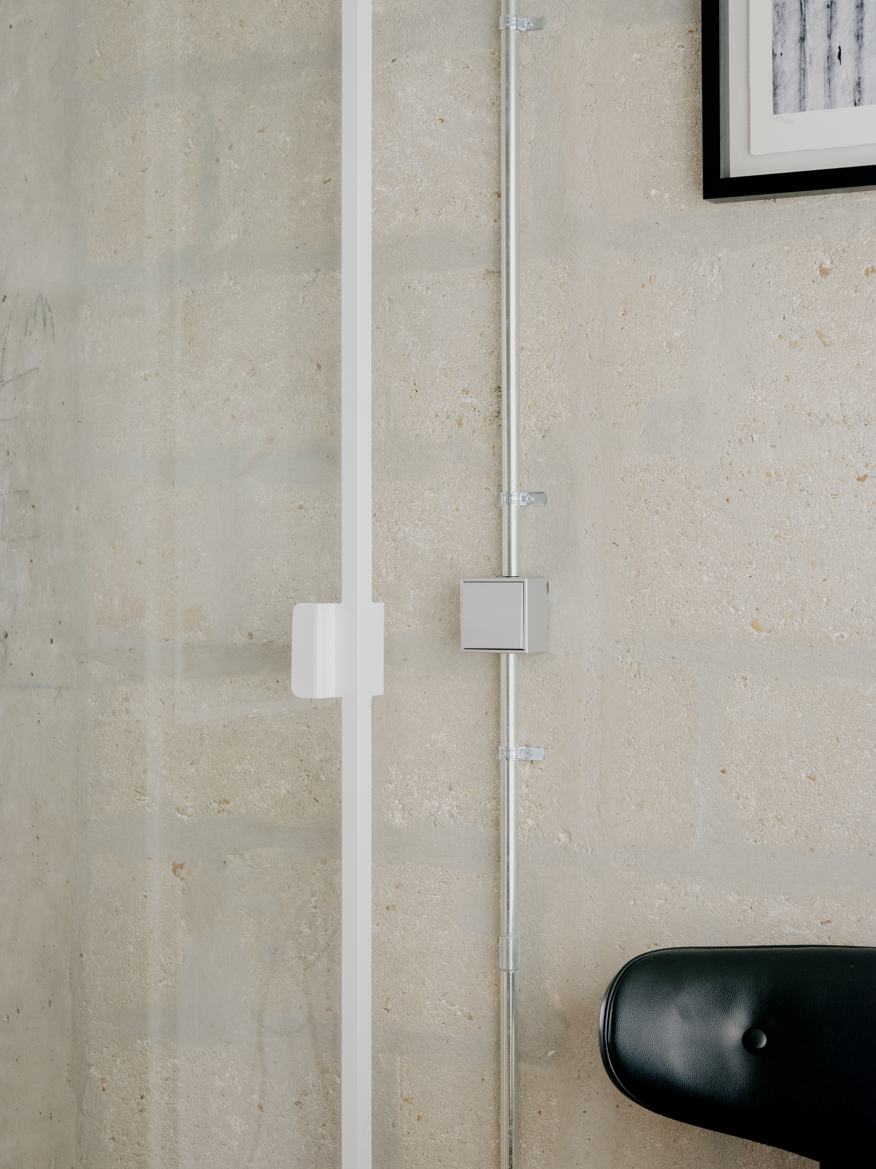 L’installation de baies à galandage permet de renforcer la transparence vers la terrasse : entièrement dissimulées dans l’épaisseur du mur, elles prolongent la continuité visuelle et spatiale amorcée entre le bureau, la cuisine et le séjour, jusqu’à l’espace extérieur.