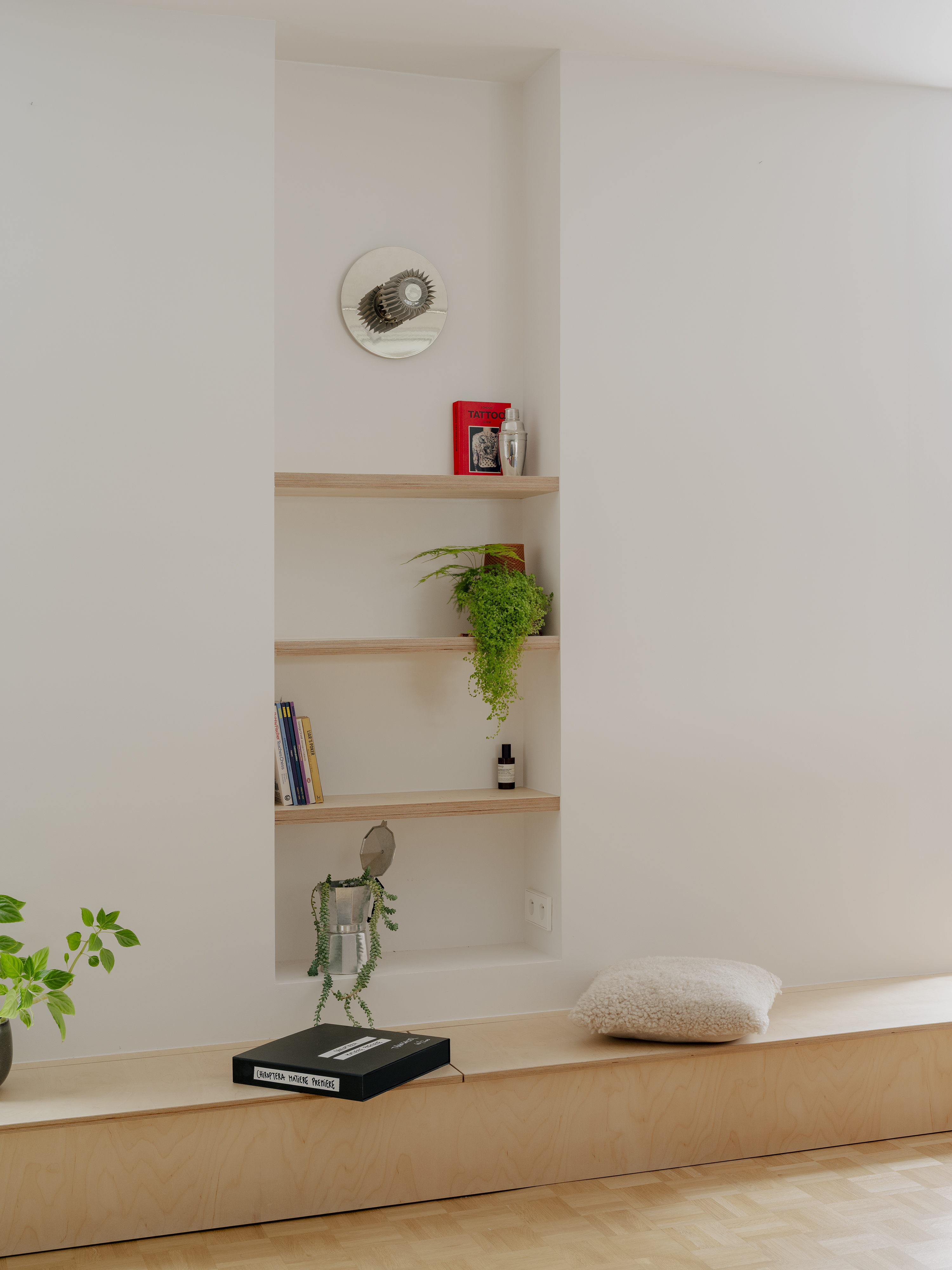 Il s’agit de rénover un appartement d’environ 95 m² avec grande terrasse, situé dans le 15ᵉ arrondissement de Paris. Resté dans son état d’origine depuis la livraison de l’immeuble dans les années 1970, il conserve les caractéristiques de cette époque : une structure en béton que le projet s’attache à révéler et à valoriser. Sa forme en L facilite l’aménagement en hiérarchisant les espaces : séjour, bureau et cuisine ouverts sur la terrasse, tandis que l’espace nuit se déploie côté cour. L’ensemble traversant profite d’un ensoleillement maximal, souligné par la transparence et l’ouverture du plan rénové.
